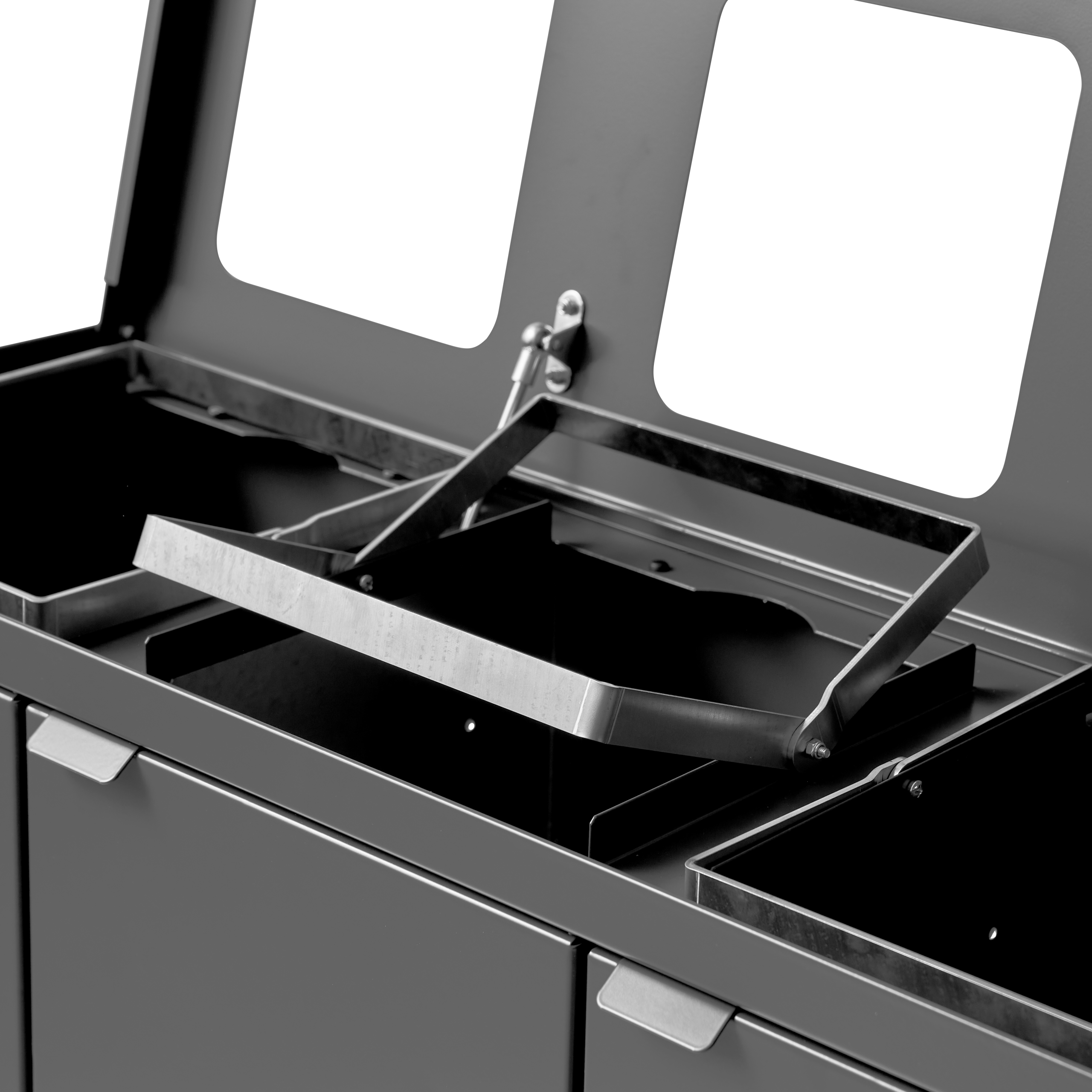 Avfallssystemet er utstyrt med frontdører med soft close for ergonomisk riktig tømming uten tunge løft. Avfallssystemet er utstyrt med integrerte og sterke poseholdere, slik at posen blir liggende. Lokket skjuler også posene, slik at avfallssystemet holder et stilrent design. Avfallssystemet er mobilt takket være de monterte hjulene, som er skjult bak sokkelen. Avfallsløsningen leveres med et magnetisk veggfeste som den skal festes til.