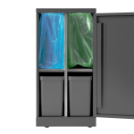 Avfallssystemet er utstyrt med frontdører med soft close for ergonomisk riktig tømming uten tunge løft. Avfallssystemet er utstyrt med integrerte og sterke poseholdere, slik at posen blir liggende. Lokket skjuler også posene, slik at avfallssystemet holder et stilrent design. Avfallssystemet er mobilt takket være de monterte hjulene, som er skjult bak sokkelen. Avfallsløsningen leveres med et magnetisk veggfeste som den skal festes til.